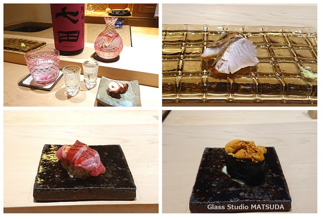 麻布十番の鮨薪介さんで日本酒と切子硝子です。