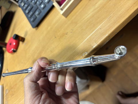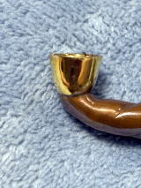 四つ銀キセル 雁首、口の部分とエッジ部は銀 そのほかは真鍮製で溶接してあります。 もうこれを作れる職人さんは1人いるかいないかだそうです。 あさがお形 |