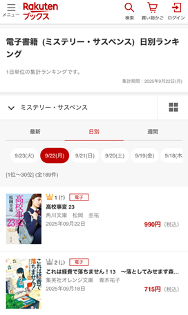 page1 2 3 4 5 6![]() 25.10.13 こちらは新たに中国で翻訳刊行された「小説家になって億を稼ごう」です(中国人民大学出版社・刊)。 ![]() 25.9.28 ![]() 「令和中野学校Ⅱ 対優莉戦」10月24日発売です。 本作では悪役の優莉結衣。まだ高校生の結衣に対し、令和中野学校の諜工員候補生らに暗殺指令が…? 予想不可の展開にご期待下さい。 11月22日「JK V」には優莉匡太が登場!? お伝えしておりますように「高校事変23」は各所のランキングで1位を記録しました。ありがとうございます。次作「高校事変24」が、すべての「高校事変」時系列での最終作、優莉家の物語のゴールとなります。劃篇などで過去が描かれることはあっても、この後のタイムラインのストーリーは存在しない、名実ともにシリーズ完結編となります。すべての決着をお楽しみに。 補足情報を一つ。コミカライズ版「高校事変」の第1巻第2話以降、第2巻の最後のエピソードまでの収録作品に限り、連載時に松岡圭祐が監修しています。第2話に挿入された消火器ミサイル(原作では4巻)、ボヒナムでの戦闘などは松岡によるアイディアとのことです。特に第2巻に収録されている作品の期間が、集中的に細かく監修が行われました。3巻収録作品以降は監修のないオリジナル作品へとトーンが変わっていったようですが、コミカライズ版の第2部以降も期待したいですね。漫画ではなく原作派という方も、是非「高校事変」コミックス第2巻をご一読下さい。 ![]() 25.9.27 ![]() 25.9.25 ![]() dブック 小説・文芸ランキング ![]() ![]() 楽天ブックス電子書籍ミステリー・サスペンスランキング 25.9.24 ![]() ![]() 楽天ブックスKADOKAWAストア ![]() Yahooショッピング 25.9.23 ![]() 25.9.22 週間ランキング第1位 9月22日更新 高校事変 23 (角川文庫) 松岡圭祐 【一般文庫 Amazon新着ランク】[T02:19:45] 25.9.17 25.9.13 ![]() 「高校事変23」予約開始されています。是非ご期待下さい。 25.9.10 週間ランキング第1位 9月8日更新 【予約】高校事変 23 (角川文庫) 松岡圭祐 【ミステリー・サスペンス・ハードボイルド Amazon新着ランク】[T04:56:45] 25.9.8 ![]() いよいよ登場!「高校事変23」9月22日に発売になります。 衝撃のセミファイナル。列島東西分裂の危機に優莉四姉妹が奔走します。 「優莉匡太 高校事変劃篇」であえて伏せられていた、ある経緯も描かれています。22巻とともに、ぜひ「優莉匡太」もお読みになられた上で、9月22日を楽しみにお待ちください。 ![]() 「令和中野学校Ⅱ 対優莉戦」10月24日発売です! 公安側の視点から描かれる本作では、なんと優莉結衣が悪役として登場。結衣がまだ高校生だったころの物語になります。予想外のショッキングな展開! 「高校事変」とのリンクを是非お楽しみ下さい。 下記9月1日の動画CMにもありますように、11月には「JK」第5巻が刊行されます。怒濤の3ヶ月連続発売にご期待下さい。 25.9.1 25.8.25 本日発売です! ![]() ![]() 「水鏡推理V ニュークリア・フュージョン 改訂完全版」「水鏡推理VI クロノスタシス 改訂完全版」発売になりました。 来月はいよいよお待ちかね「高校事変23」です。 最高にお楽しみ頂くには「優莉匡太 高校事変劃篇」を事前にお読み頂くことが必須となります。今のうちに是非ご一読下さい! 25.8.20 25.7.25 ![]() ![]() 「八月十五日に吹く風 改訂完全版」「水鏡推理IVアノマリー 改訂完全版」発売になりました。 10月刊は「令和中野学校II 対優莉戦」が正式タイトルになりました。 9月刊はお待ちかね「高校事変23」 8月刊は「水鏡推理Vニュークリア・フュージョン 改訂完全版」「水鏡推理VIクロノスタシス 改訂完全版」 書き下ろし連続刊行復活までもう間もなく! ご期待下さい。 25.7.4 ついに刊行決定! 「高校事変23」9月刊 「令和中野学校II」10月刊 お楽しみに! 25.6.13 ![]() ![]() 6月17日に早くも発売! 「水鏡推理II インパクトファクター 改訂完全版」「水鏡推理IIIパレイドリア・フェイス 改訂完全版」どうぞご期待下さい。 ![]() 「水鏡推理 改訂完全版」角川文庫より発売中です。こちらも是非ご一読下さい。 25.6.11 「万能鑑定士Qの事件簿IX」にも登場(?)された元角川書店社長・元KADOKAWA副社長の井上伸一郎氏による「メディアミックスの悪魔(星海社新書)」が刊行されました。日本におけるサブカルチャーとメディアの色濃い歴史が、その核となった人物の視点により余すところなく記載されている、大変興味深く面白い一冊です。是非ご一読下さい。 ![]() 6月下旬には「水鏡推理II インパクトファクター 改稿完全版」、「水鏡推理III パレイドリア・フェイス 改稿完全版」が角川文庫より発売。 7月下旬末には「八月十五日に吹く風 改稿完全版」「水鏡推理IV アノマリー 改稿完全版」が角川文庫より発売。 8月末には「水鏡推理V ニュークリア・フュージョン 改稿完全版」「水鏡推理VI クロノスタシス 改稿完全版」が角川文庫より発売です。 気になる「高校事変23」は…。なんと目下執筆中! シリーズ始まって以来の熟成期間を経ての登場となります。こちらもどうぞお楽しみに