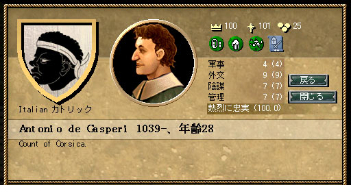 Genoa軍がGenoaに居座った場合は、一度激突してみて、被害が出る前にすぐ撤退し、敵が出払ったら、 Genoaを包囲します。 ドイツ諸侯が続々包囲に参加してくれて、Genoa軍を何度かはじき返し、見事Genoaを陥落させました。 つぎは、海を渡って、Corsica攻略です。 ―――つづく――― →第4話 「Corsica/Arborea/Cagliari攻略戦」へ |