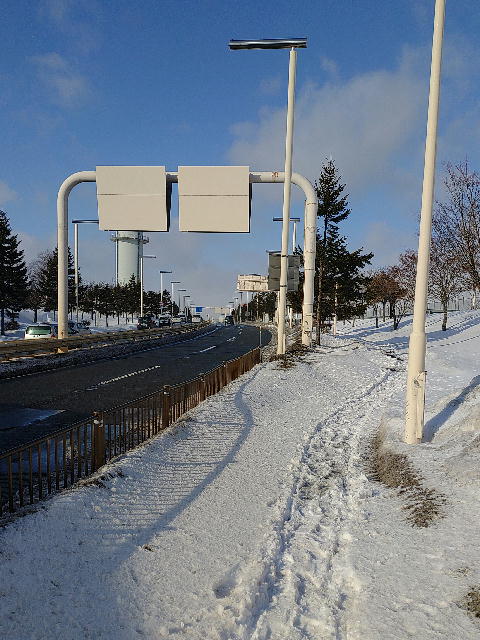 いざ外を歩き始めると、気温はさほど低くないのに風がかなり強い。台風並みの風が吹く中を歩くのはかなり難儀であった。それでも南千歳から新千歳空港への乗り換えを諦めた旅人が南千歳側から何人か歩いてきたので踏み跡はしっかりと付いているだろうとそのまま強行突破。しかし例年よりも気温が高いとはいえそこは北海道、しかも強風で体感温度はどんどん下がる。特に頭が冷やされるのが辛い。2km少々の道のりに30分近くかかってしまった。南千歳駅に到着したらホッとして緊張が一気に解けて低血糖のようなふらつきに襲われたが、多分広島空港で試飲しすぎた酔いがまわってきただけだろう。とりあえずモバイルICOCAをタッチしてホームへ降りた。