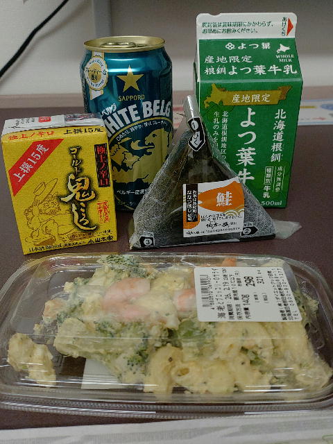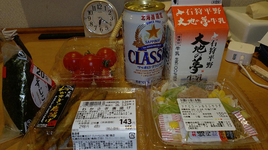 札幌に着いたらちょっと早いけどそのままホテルへチェックインして少し休んで近所のまいばすけっと(イオンのコンビニ版)で夜食と晩酌を購入。