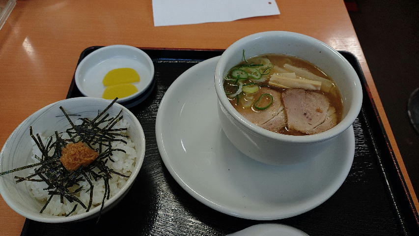 旭川についてら天金でハーフ醤油ラーメンと山わさびライスを注文。