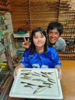 | 《メモ》 ・小島さんファミリーの登場です。 ・今回は、今絶好調のマハゼを狙ってお出かけ下さいました。 ・今回は、立田上流のポイントをご紹介しました。 ・日中の下げ潮からの挑戦です。 ・ポイントに到着すると、先客がいたため少しずれて釣り座を構えたそうです。 ・ちょい投げ&延べ竿で挑戦しました。 ・時合いということで、開始からアタリがあったそうです。 ・上がってきたのは、元気一杯のマハゼだったそうです。 ・それを皮切りに、ちょい投げ&延べ竿共にコンスタントにアタリが続いたそうです。 ・潮がだんだん下がってくると、底が透け見えハゼ釣りを楽しんだそうです。 ・その後、先客が帰り、狙いのポイントで後半戦スタート! ・ちょい投げをメーンに入れ食いモードに! ・もちろん、足元でもコンスタントにアタリはあったそうです。 ・潮止まり以外は、絶えずアタリがあったそうで、今日は楽しい釣りになったとのことでした。 《店主から》 ・帰りにお立ち寄り下さり、ありがとうございました。 ・やりましたね! ・見事、マハゼゲットですね! ・透明感のある綺麗な魚体のマハゼ達ですね。 ・この美しい魚体が、木曽川マハゼの特徴ですね。 ・そして、なんと言っても今回は見事な束釣りでした! ・潮止まり以外は絶えずアタリがあったそうで、かなり忙しい釣りになったかと思います。 ・今年も魚影はすこぶる濃く、やり取りの忙しさは嬉しい悲鳴ですね! ・今回の釣果を見た多くの木曽三川マハゼファンは、大変刺激を受けていると思います。 ・将来が楽しみな釣りキッズですね! ・今回は小気味よいマハゼの引きを堪能できたそうで、ファミリーでの良い思い出になりましたね。 ・今後は11月初旬にかけ一潮毎に大きくなっていくマハゼの数釣り、それ以降は年内ヒネハゼ釣りが楽しめます。 ・この勢いで、次回はさらなる数&サイズアップに挑戦ですね。 ・またお出かけ下さい。 ・次回のご来店、心よりお待ち致しております。 |