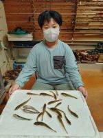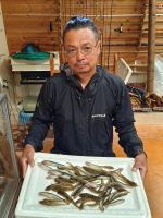 | 《メモ》 ・お馴染み、常連の川田さんです。 ・木曽三川での釣り&北陸でのボート釣りを楽しまれています。 ・今年はボート釣りに出掛けておらず、これまで木曽三川のマハゼ、手長エビ、ウナギを楽しまれていました。 ・今回は、今絶好調のマハゼを狙いました。 ・これまで数釣りをされていたため、今回は型狙いに挑戦。 ・向かった先は、立田下流のポイント。 ・脈釣りで狙いました。 ・雨の中での釣りでした。 ・最初に入った釣り座ではアタリが散漫だったそうで、少しずつ移動しながらの釣りでした。 ・当たった釣り座では、仕掛けを入れる度にアタリがあったそうです。 ・そこで腰を据えて納竿まで楽しんだそうです。 ・平均サイズも良かったそうで、今後の冷え込みが楽しみとのことでした。 《店主から》 ・帰りにお立ち寄り下さり、ありがとうございました。 ・雨の中での釣り、お疲れ様でした。 ・やりましたね! ・見事、マハゼゲットですね! ・透明感のある綺麗なマハゼ達ですね! ・16cmを筆頭に平均サイズの良いマハゼが釣れましたね! ・雨の中でしたが、マハゼの活性は高かったそうで相変わらず魚影は濃いですね。 ・まだ浅瀬にも数多くのマハゼがいるようで、11月以降の強い冷え込みまではポイント全体で釣れそうですね。 ・そんな中でも深場に隣接するポイントでは、平均サイズも良いですね! ・延べ竿ということもあり、今回はマハゼの引きを十二分に堪能できましたね。 ・今回は、川田さんのフットワークの良さが好釣果へと繋がったと思います。 ・11月以降の強い冷え込み後は、さらにサイズアップします! ・この勢いで、11月&12月は良型の数釣りですね。 ・またお出かけ下さい。 ・次回のご来店、心よりお待ち致しております。 |