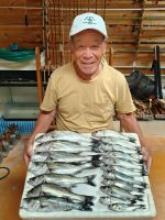 9月14日 立田大橋下手 ・一宮市の飯田櫂士さん。 ・セイゴ25cm頭、4匹。(他にもアタリあり、マハゼの餌取り多い) ・マハゼ14cm頭、18匹。(他にもアタリあり) ・セイゴ:青イソメ、マハゼ:石ゴカイ。 ・午前の釣り。 |