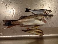 1月4日 油島 ・あま市の小寺さん。 ・マダカ40cm×2。 ・セイゴ38cm×2。 ・小セイゴ。(すべてリリース) ・青イソメの房掛け。 ・午前7時から4時間程の釣り。 |