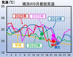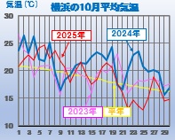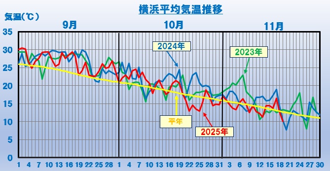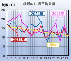 しかしながら、右に2023年と2024年の横浜の11月の平均気温の推移から分かる様に11月/中旬気温が高く推移し紅葉は進まず、実質紅葉が始まったのは10/27でした。
