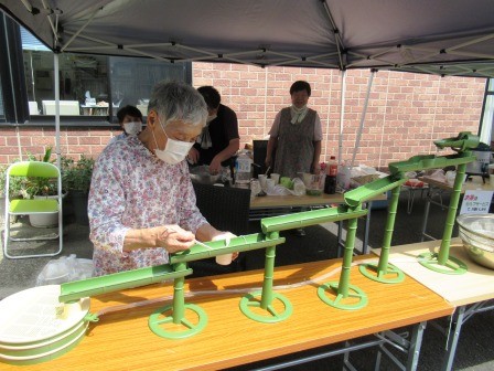 毎年、山で竹を切って来るのは大変だったので、いいアイテムを手に入れました!流れて来るそうめんを見る眼差しは、皆さん真剣です。冷たいおつゆにつけて、ツルツルっと食べれば、いつもより食欲もアップです♪