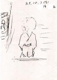 着物を着て座ってる女の方の横に・・・ちょっと複雑な亡くなり方をされた〇〇さんのお父さんが、仏壇の様な形の中に居られる場面を描いたな・・・。