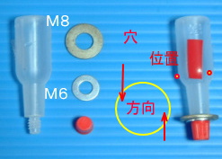タレびんの口に、M8とM6ワッシャー入れ、タレびんのふたをする。 |