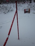 持参していたゾンデ棒で積雪心を測定してみた。それぞれ80cm・55cmくらいであった。新小屋峠からは、関金~鏡ヶ成間の冬季通行止めの車道を緩やかに降っていくが、後半はショートカットで