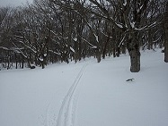 樹林帯を突っ切った。樹林帯も緩斜面なので、ほぼ直滑降である。鏡ヶ成の雪原に出て、擬宝珠山を正面に見ながら、休暇村ホテル手前で車道を横切って再び雪原に入り、出発点に帰着した。