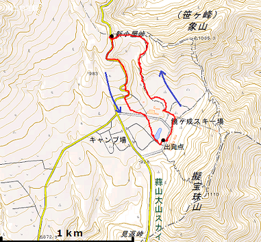 出発点(920m)11:15 象山西斜面(960m)11:47/53 新小屋峠(990m)12:11/17 出発点12:41