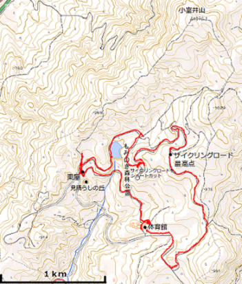 体育館前(900m)7:25 サイクリングロード最高点(965m)8:22/34 東屋(890m)9:40/59 体育館裏10:19