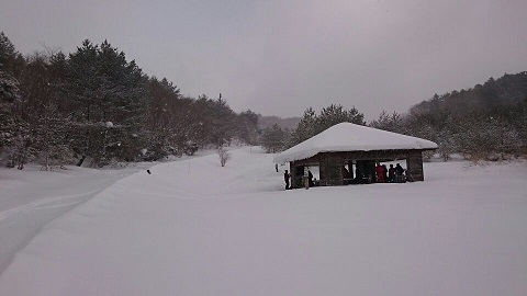 翌日は小雪となったので、全員が山中での行動に出発した。例年だとキャンプ場を突っ切ってサイクリングロード最高点へと近道をするのだが、今回はサイクリングロード通しに(反時計回りに)進んだ。