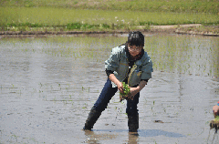 このあたりの田んぼにはゴミなどを捨てていく不届きものがいるため,裸足での田植えはご遠慮いただくことにしていたのですが,長靴では足抜けが悪く動きづらいので,結局裸足でやる人もいました。今後の課題にしたいと思います。