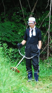 プライムブルーのジョンさんこと鈴木正之さんから刈り払い機の使い方の説明を受けて作業開始です