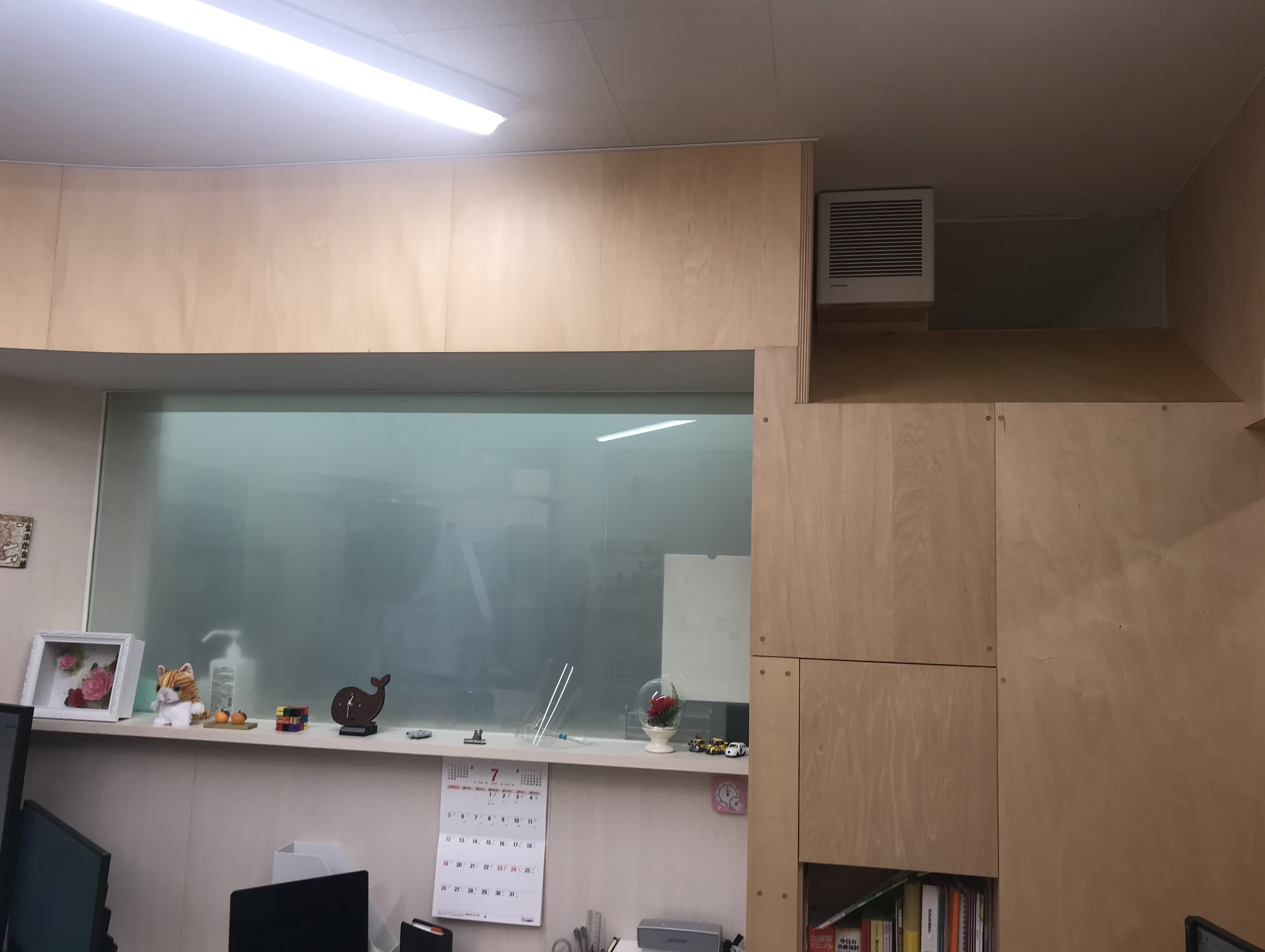 マスクのできない乳幼児が待つスペースにも換気扇をつけています。