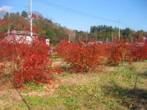| 9月・・・閉園後、人影が見られなくなったブルーベリー園小鳥たちが残った実を食べにやってきています。 | 12月・・・真っ赤に紅葉したブルーベリーの樹 |