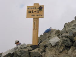 9:57小仙丈岳(こせんじょうだけ)に到着。 後半の急な登りがかなりこたえた。 体力の衰えを改めて実感!! |