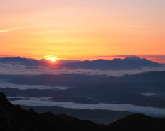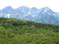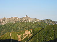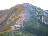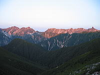 反対側に目を転じると、穂高から槍にかけての稜線が赤く