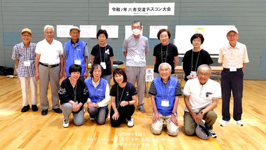 | 令和7年 9月28日 | 6市(豊中・交野・茨木・高槻・堺・松原)交流親睦ディスコン大会が豊中市の宝泉家 千里体育館において13:00から開催され、シニア松塚ディスコンクラブ部員は、交野チームとして2チームに別れ出場しましたが、残念ながら成績は振るいませんでした。優勝は全勝の交野4チーム(玉手箱)でした。 | ||||||||||||||||||||