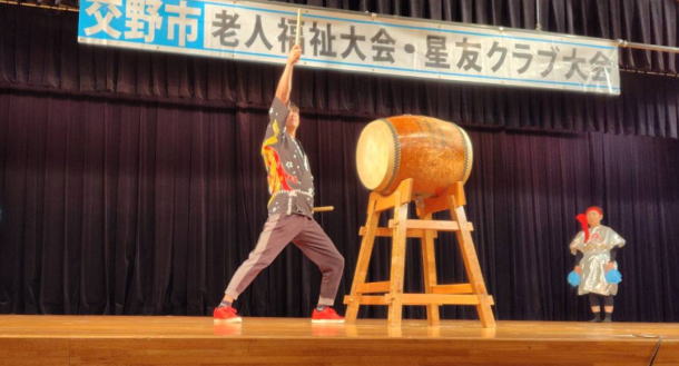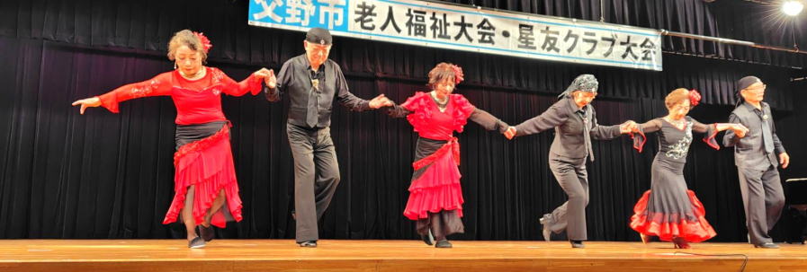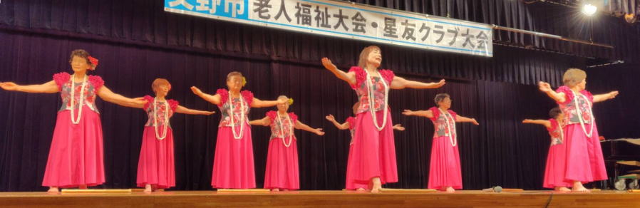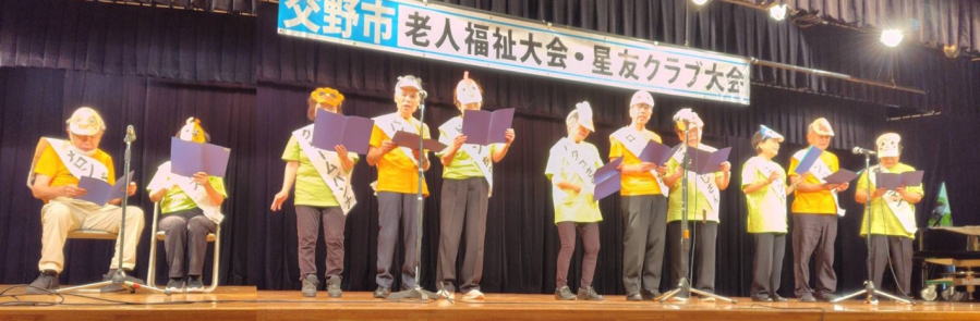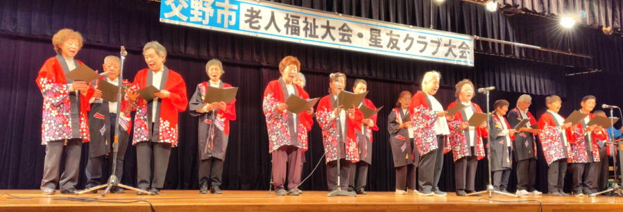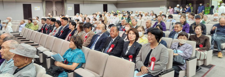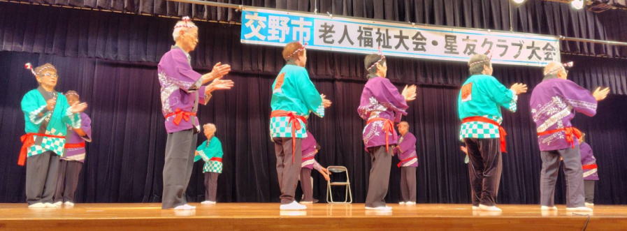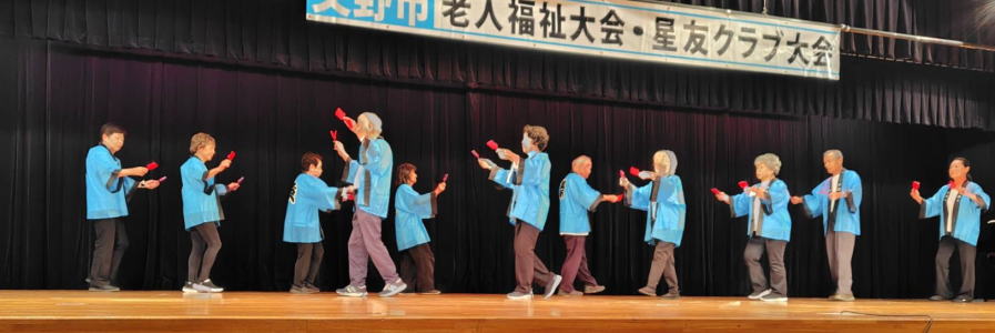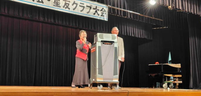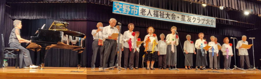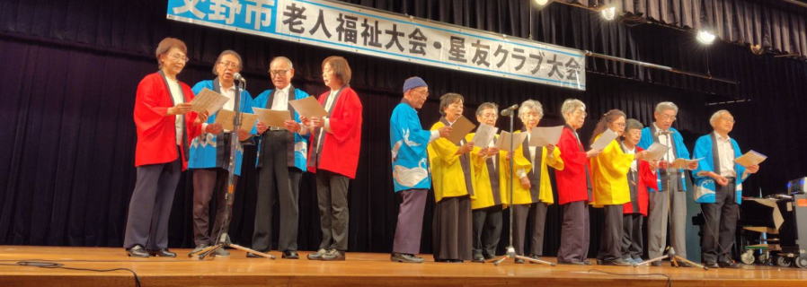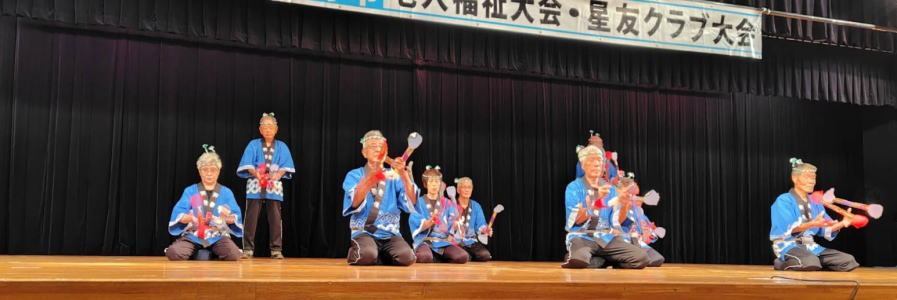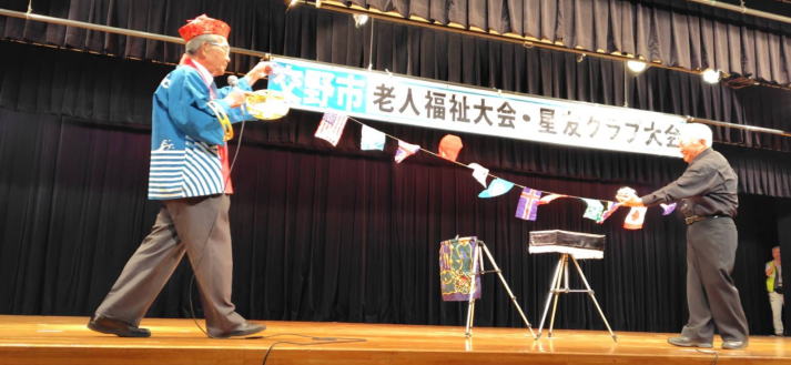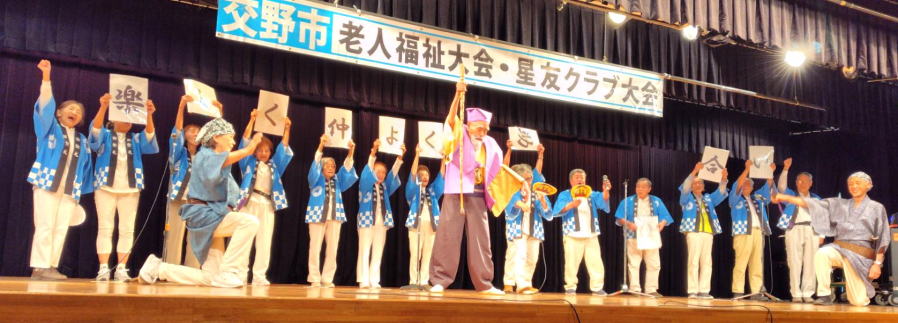 令和6年10月 5日 | 老人福祉大会・星友クラブ大会は、 ゆうゆうセンター交流ホールで開催されました。 第一部:式典は1:開会の言葉、2:国歌斉唱、3:市長挨拶、4:市星連会長挨拶、5:祝寿記念品等授与99歳10名(代表者授与)、《交野市》金婚式記念品83組、《市星連》祝寿敬老品(昭和9年生まれ)31名、感謝状贈呈8名(退任会長)、6:来賓祝辞 市議会議長、衆議院議員、大阪府議会議員、7来賓紹介、8:協力者の紹介(交野市民生委員・児童委員協議会)、9:閉会、 第二部各単位クラブによる演芸発表(16演目) |