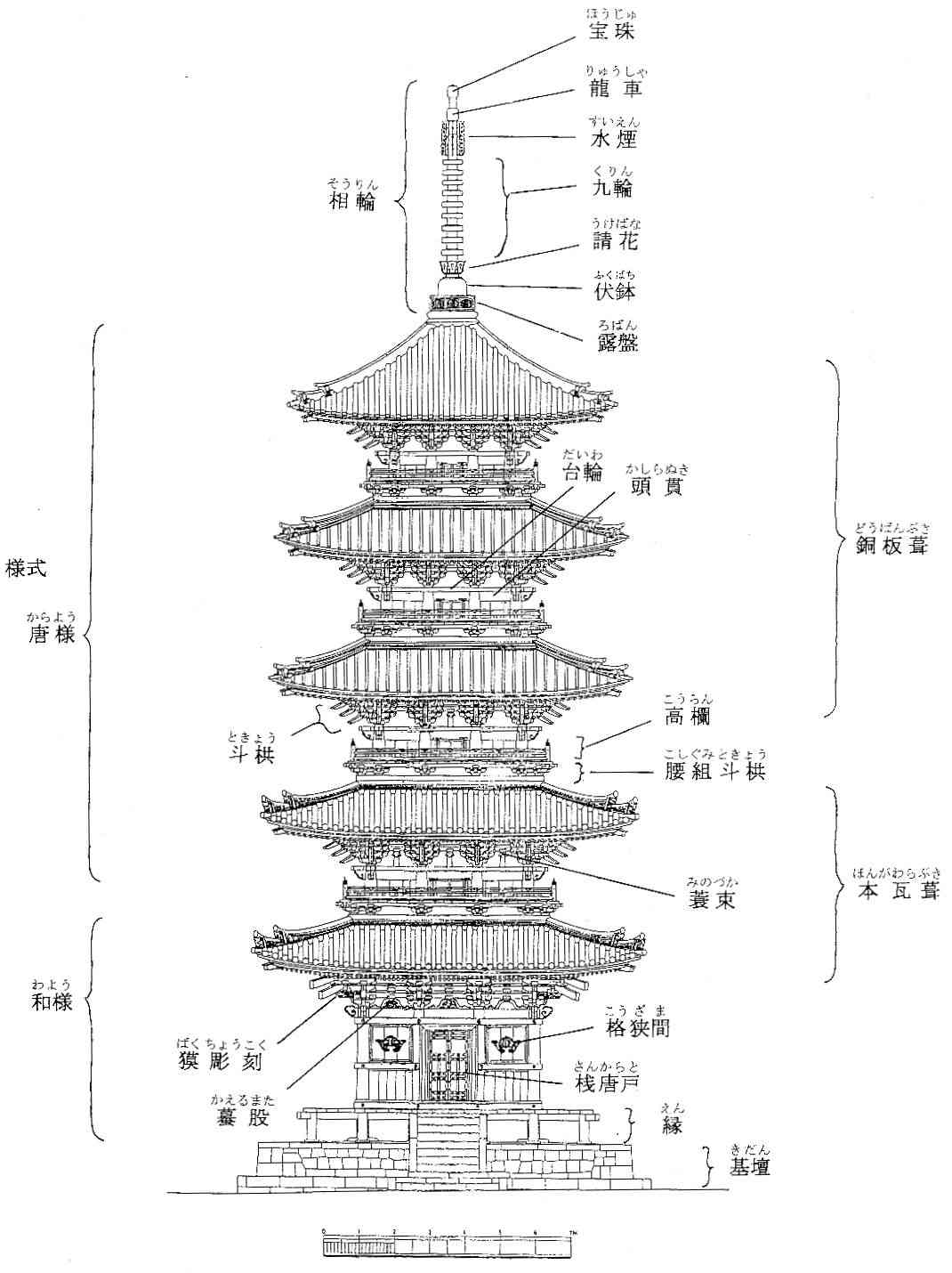 軒廻:初重は和様、2−5重は唐様を用いる。