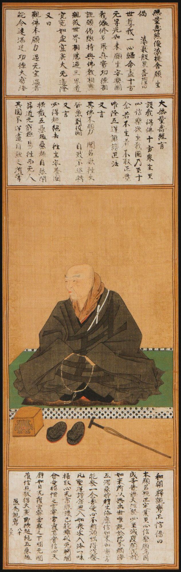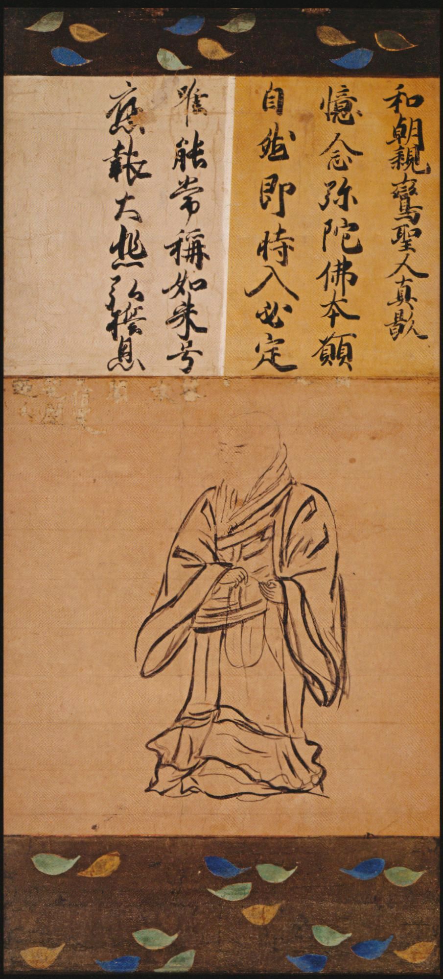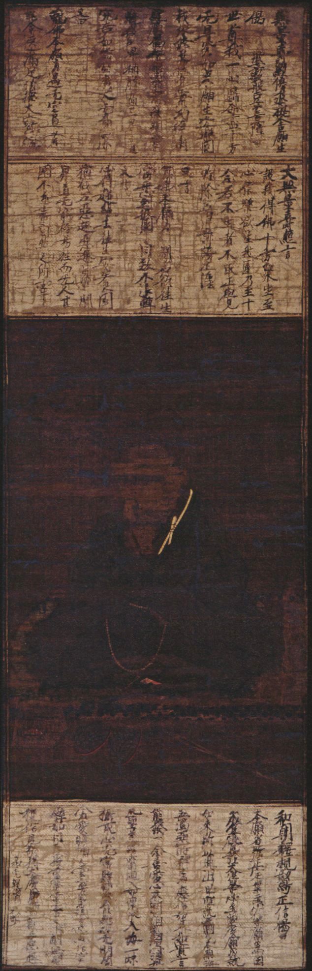 ◇鸞聖人影像(鑑御影):【国宝】、京都西本願寺蔵、覺如賛・専阿弥陀仏筆、鎌倉期、紙本墨画、74×33cm