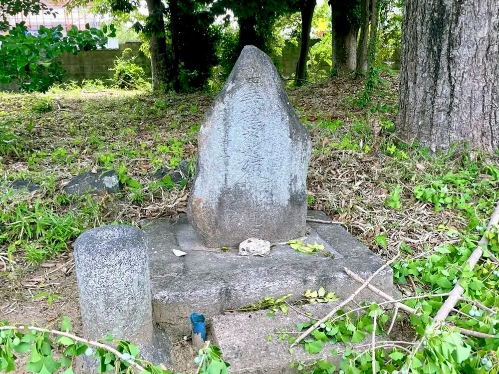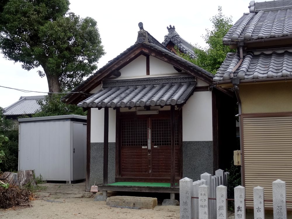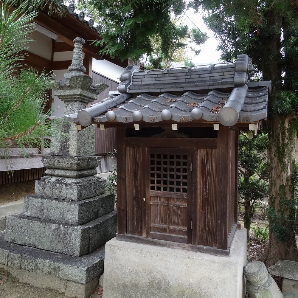 大日堂題目塔:辛うじて題目だけ判読できるが、橿原市史によれば「南無妙法蓮華経/開運/如見碑」)があり「村中安全 明治五申吉日」と刻む題目塔と思われる。