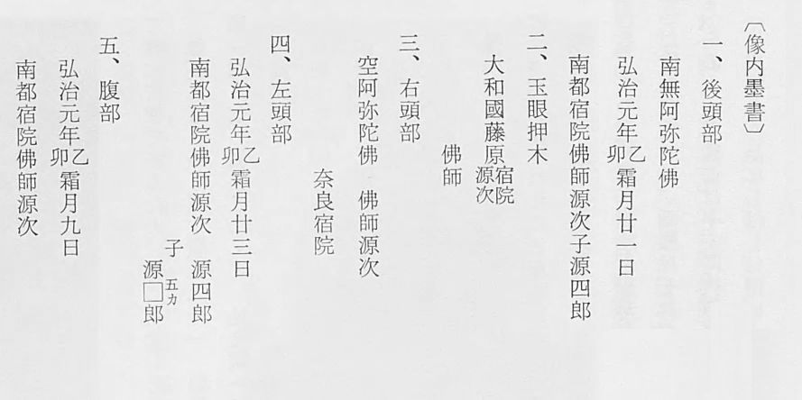 また、像には墨書銘がある。弘治元年(1555)に南都宿院仏師源次らの作になる。