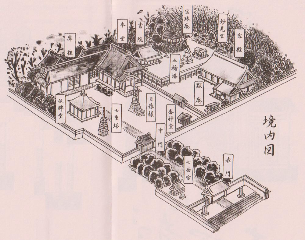 市街地から離れたところにあるのが幸いしたものか、今なお本堂(桃山期・重文)多宝塔・惣門(室町期・重文)などの伽藍と塔中7院を有する。