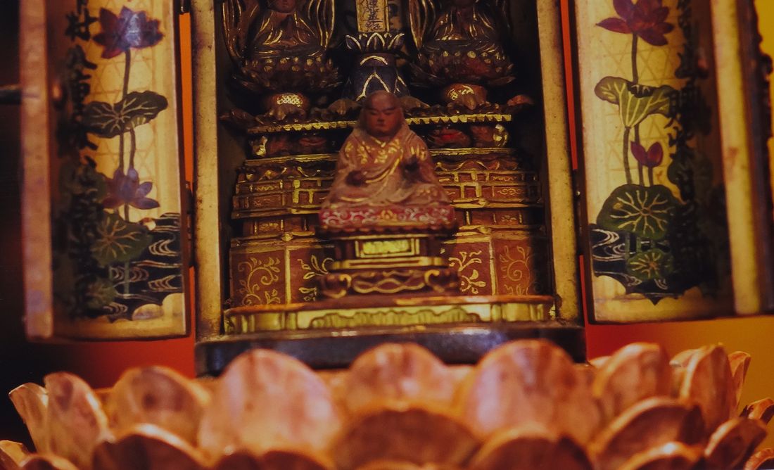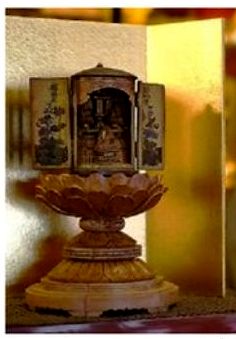 日蓮上人坐像:極小の秘仏が公開、総高7cmに厨子に納められている。直ぐ上の「日蓮上人坐像」と同じ像である。