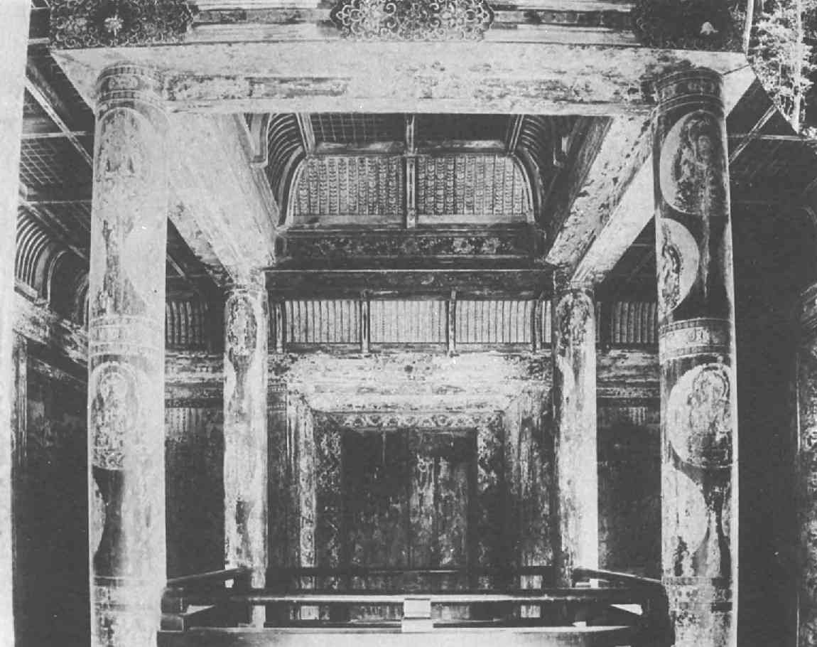| 311 | 近江西明寺 【国宝】 池寺。 (開山三修上人の感得により池の中より薬師如来が湧出したと云う開山譚による。) ○三重塔は(建立年代を示すものは何も無いが)鎌倉中期あるいは後期の典型的な純和様建造とされる。 初重一辺13尺8寸6分2厘(4.2m)、中央間5尺2寸5分8厘、両脇間4尺3寸2厘 二重一辺11尺8寸5分、中央間4尺2寸6分6厘、両脇間3尺7寸9分2厘 三重一辺10尺1分、中央間3尺6寸4分、両脇間3尺1寸8分5厘 高さ66尺3寸(20m強)。桧皮葺き。 本尊は金剛界大日如来、四天柱が立ち、内部には極彩色の仏画・壁画が描かれている。 2015/03/05追加: ○「西明寺・金剛輪寺」井上隆雄撮影、浜島正士解説、新潮社, 1992. より 三重塔彩色紋様の図及び解説あり。 明治41〜43年解体修理、昭和13年、昭和48年、屋根葺替修理。 三重塔初重内部3 三重塔初重天井・四天柱 三重塔初重天井 2007/03/03「日本建築史基礎資料集成・塔婆U」: 西明寺三重塔立面図 2007/08/12追加:「滋賀県写真帖」、滋賀県、明43年 より 近江西明寺三重塔 近江西明寺三重塔内部 2010/01/10追加: ○「滋賀県市町村沿革史編纂委員会/撮影」 昭和30年西明寺三重塔 昭和30年西明寺本堂 ○西明寺発行ルーフレット(1990年年頃か) 近江西明寺三重塔 2001/10/077撮影: 近江西明寺三重塔1 近江西明寺三重塔2 近江西明寺三重塔3 近江西明寺三重塔4 近江西明寺三重塔5 近江西明寺本堂1 近江西明寺本堂2 近江西明寺本堂3 近江西明寺本堂4 近江西明寺二天門 2007/11/18撮影: 西明時三重塔11 西明時三重塔12 西明時三重塔13 西明時三重塔14 西明時三重塔15 西明時三重塔16 西明時三重塔17 西明時三重塔18 西明時三重塔19 西明時三重塔20 西明時三重塔21 西明時三重塔22 西明時三重塔23 西明時三重塔24 西明時三重塔25 西明時三重塔26 2015/02/24追加: ○「朝日百科・国宝と歴史の旅 8 塔」朝日新聞社、2000 より 初重に心柱は通らず、須弥壇の中央に金剛界大日如来を安置し、四天柱に金剛界32尊(四仏を除く)を描き、金剛界曼荼羅空間を作りだす。 三重塔初重内部 ※現在は須弥壇上には大日如来1体であるが、かっては4仏が祀られていたのかも知れない。そうすれば金剛界37尊全てが揃うことになる。 2015/02/27追加: ○「日本の美術77 塔」石田茂作編、至文堂、昭和47年 より 三重塔初重内部2:扉には八天を描く。 三重塔初重内部壁画:部分図でこれは見宝塔品の説相であろう。 このように周壁には法華28品の説相図を描く。 2015/03/05追加: ○「日本の美術143 密教建築」伊藤延男編、至文堂、昭和53年 より 西明寺三重塔 三重塔初重内部4 本堂(国宝):7間×7間の大堂で、鎌倉期の純和様の典型建築といわれる。 当初は5×5間堂であったが、南北朝期に周囲1間通りが拡張され、7間堂となる。 2007/11/18撮影: 近江西明寺本堂11 近江西明寺本堂12 近江西明寺本堂13 近江西明寺本堂14 近江西明寺本堂15 近江西明寺本堂16 近江西明寺本堂17 近江西明寺本堂18 近江西明寺本堂19 近江西明寺本堂20 近江西明寺本堂21 ニ天門(重文):応永14年(1407)の再興。桁行3間梁間2間の八脚門。入母屋造、屋根杮葺。 近江西明寺ニ天門11 近江西明寺ニ天門12 近江西明寺ニ天門13 寺伝では仁明天皇の勅願によって承和元年(834)三修上人(伊吹山開山上人)が開創したと伝える。 龍應山と号す。中世には寺領2000石、17堂宇・12社・300坊があったと伝える。 元亀2年(1571)織田信長と六角佐々木氏との兵乱で、百濟寺方に加担したかどで、信長の命により火を掛けられ、本堂・塔婆・ニ天門を残し悉く焼亡する。 近世には細々と復興するも、明治維新でほぼ壊滅し、長い参道脇に坊跡を連綿と残す。 近江西明寺参道坊跡1 近江西明寺参道坊跡2 近江西明寺参道坊跡3 現在は本坊のほか円教坊・観正坊のみを残す。 2020/06/26追加: 2020年次のような報道発表がなされる。 本堂内陣の柱(本尊薬師如来像前にある西柱と南柱)に菩薩立像が描かれていることが判明する。柱は黒く煤け、これまで何が描かれているのか分からなかったが、周囲の仏像を移動させ、高さ3〜4mに描かれた絵を赤外線で撮影したという。柱絵は損傷や後世の描き直しがされた部分もあったが、一部に制作当初とみられる表現が残り、分析(広島大学安嶋紀昭教授/美術学史)によれば、菩薩の鼻の線はほぼ垂直に引かれ、耳は肩に触れそうなほど長く描かれ、像は長身で細面で線が太いく、耳の中や手のひらの描き方は単調で、隋代(581-618)の描法の特徴を表わすという。飛鳥期の法隆寺玉虫厨子の扉の菩薩像に酷似しているといい、「絵画としては日本最古級」と分析した。 本堂は建築様式などから鎌倉初期の創建とされるが、柱絵は飛鳥時代に描かれた可能性がある故に、「柱を含む仏堂が当時建てられ、鎌倉時代に改築された」可能性を指摘する。 また、西明寺の云う承和元年(834)の創建はさらに遡る可能性があるともした。 各種報道発表 より 近江西明寺本堂柱1 近江西明寺本堂柱1 柱絵菩薩立像 西柱菩薩立像 以上の本堂柱絵の発見を受け、「oshiro tennsyukaku」氏は次のように云う。(メール受信) 「この柱の伐採年と伐採地が判明でき