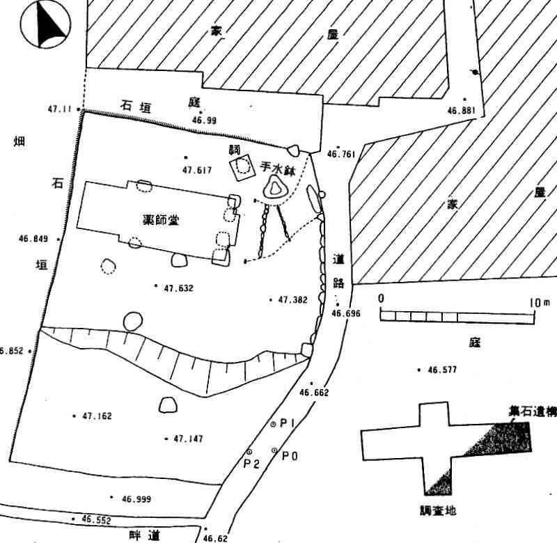 発掘調査では基壇状石列、基壇化粧石、礎石建物跡、溝などを発掘、また甕、壷、青磁、白磁、土師器、瓦、鉄釘、鉄製相輪、鉄製刀子などの鎌倉〜室町期の遺物も多く採取される。