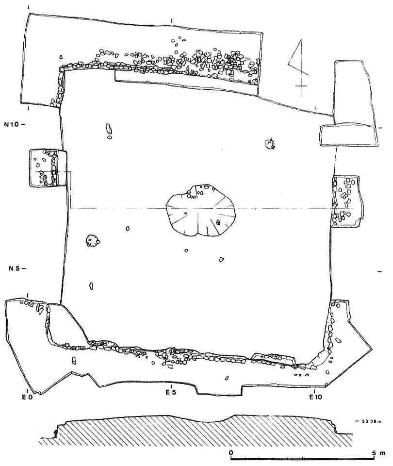 C・Dトレンチは礎石を発掘、礎石から3間四方で、4面に縁を付設する。柱間は中央間が両脇間より広い礎石配置であった。