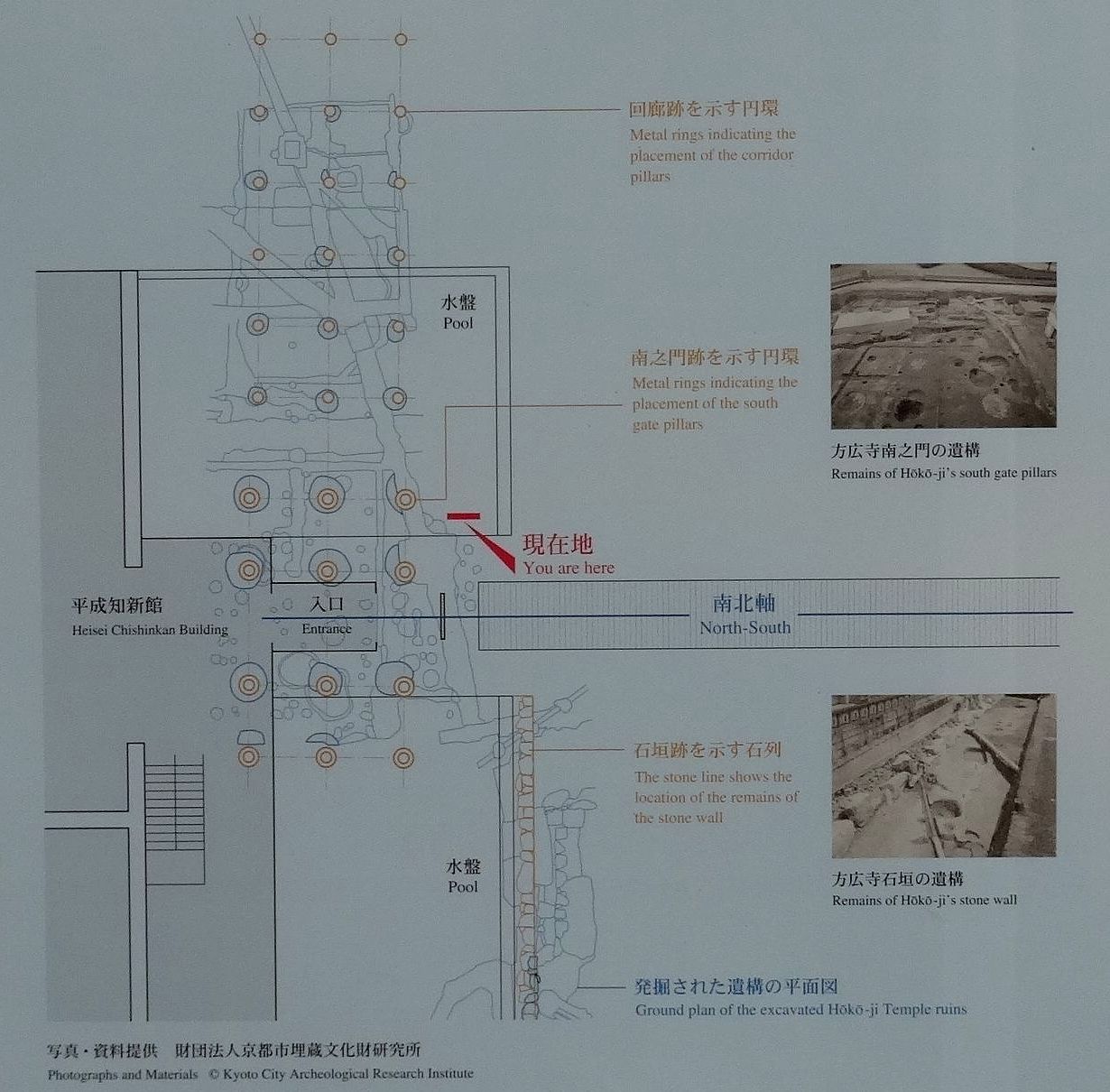 平成知新館の工事に先立ち発掘調査が行われ、この新しい入口の地下約1mの深さから、方広寺南之門跡や廻廊跡の柱の根石が検出される。