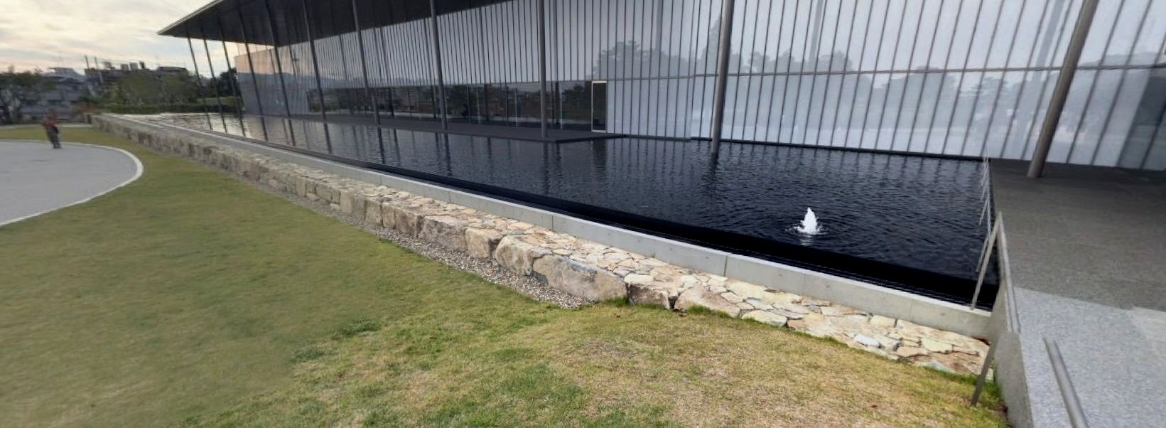平成知新館前水盤:水柱の向かって左に方広寺南辺石垣(復元)がある。