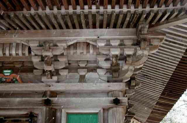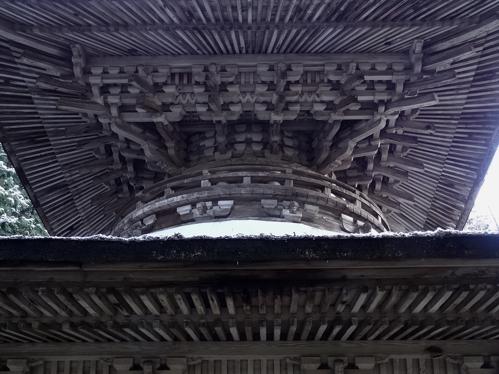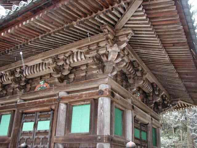 | 659 | 播磨荘厳寺 正徳5年(1715)建立。心柱墨書と棟札によって、正徳元年(1711)に起工し、同3年に棟札をあげ、同5年に完成していることが知られる。塔の創建は建久年間(1190年代)佐々木嵩綱によると伝える。 多宝塔は本堂に向かって右(南)にあり、やや規模の大きな塔である。一辺 5.0m。技法はほぼ和様に統一され、落ち着いた雰囲気である。支割は中央間をやや広く14支分、両脇間は12支に割る。屋根檜皮葺。 内部には背面寄りに二本の柱を立てて来迎柱とし、その前に禅宗様の仏壇を据えて釈迦如来坐像を安置する。上重は円柱12本を内法長押と台輪で繋ぎ、尾垂木付四手先の組物を組む。 大工は氷上郡久下谷川村清水七郎左衛門清光と清水武右衛門真信である。平成13年度兵庫県県文に指定される。 荘厳寺は白雉年間、法道仙人の開基と伝え、加東郡の西光寺を行場とする修験の寺院であり、現在高野山真言宗に属する。現在の伽藍は姫路城主本多氏の寄進による。播磨のはずれの辺鄙な山里にある。山裾に本坊があり、坊舎跡と思われる地形を左にみて、山中を登っていくと杉・楓の木立の中の鐘楼・本堂(慶長11年)・多宝塔に達する。 ○「黒田庄町史」黒田庄町史編纂委員会編、 黒田庄町、1972 より 荘厳寺は真言宗、粧林山と号す。本堂から下の方へ僧坊の跡が残り、建物の一部が現存する。文献上、西之坊、北之坊、南之坊、岩本坊、実相坊、一乗坊、長円坊、阿弥陀坊、成就坊、中藏坊等が知られるが、現存のものがそのどれであるのかは不明である。 荘厳寺現存僧坊:但し2001年4月及び2018年正月の訪問時には既に退転していたものと思われる。写真左端の白塀は法音院と思われ、そうだとすれば、この写真の残存僧坊は法音院の西側参道を挟んだ西側にあったものと思われる。 また荘厳寺は社の朝光寺とともに社鴨川の西光寺を行場とする修験の寺であった。 塔頭には法音院、蓮華院、宝樹院があったが、現在は法音院のみとなる。 近世初め本多政勝による寺領寄進があり、さらに境内・伽藍が整備される。慶安2年本多氏より梵鐘の寄進があり、宝永5年(1708)八幡宮を建立、正徳元年(1711)多宝塔が再興される。延宝5年の検地では境内地56町歩、観音堂・塔・鐘楼・坊舎8ヶ寺3反4畝、田畑2町5反余が除地とされる。 播磨荘厳寺付近図 2001/09/01撮影: 夕暮 ・逆光のため不首尾である。 播磨荘厳寺多宝塔1 播磨荘厳寺多宝塔2 播磨荘厳寺多宝塔3 播磨荘厳寺多宝塔4 播磨荘厳寺多宝塔5 2018/01/04撮影: 荘厳寺多宝塔11 荘厳寺多宝塔12 荘厳寺多宝塔13 荘厳寺多宝塔14 荘厳寺多宝塔15 荘厳寺多宝塔16 荘厳寺多宝塔17 荘厳寺多宝塔18 荘厳寺多宝塔19 荘厳寺多宝塔20 荘厳寺多宝塔21 荘厳寺多宝塔22 荘厳寺多宝塔23 荘厳寺多宝塔24 荘厳寺多宝塔25 荘厳寺多宝塔26 荘厳寺多宝塔27 荘厳寺多宝塔28 荘厳寺多宝塔29 荘厳寺多宝塔相輪 荘厳寺山内参道 荘厳寺法音院1 荘厳寺法音院2 荘厳寺法音院3 荘厳寺法音院山門1 荘厳寺法音院山門2 荘厳寺法音院玄関 法音院持仏堂1:明治13年再建 法音院持仏堂2 山門・庫裡・玄関 荘厳寺法音院庭 荘厳寺法音院裏門 荘厳寺大師堂:大正9年建立 坊舎跡・参道1 坊舎跡・参道2 坊舎跡・参道3 坊舎跡・参道4 荘厳寺本堂1:慶長16年(1611)再建 荘厳寺本堂2 荘厳寺本堂3 荘厳寺本堂4 荘厳寺本堂5 荘厳寺本堂6 荘厳寺本堂7 荘厳寺本堂8 荘厳寺鐘楼:慶安2年(1649)本多政勝寄進 弁財天・稲荷大明神 鎮守三社八幡1:宝永5年(1708)建立、中央八幡大菩薩、右殿熊野三社権現、左殿高野大明神丹生大明神を祀る。 鎮守三社八幡2 鎮守三社八幡3 鎮守三社八幡4 鎮守三社八幡5 鎮守三社八幡6 鎮守三社八幡7 補足資料: ○「黒田庄町史」黒田庄町史編纂委員会編、 黒田庄町、1972 より 当地黒田庄には神宮寺が多い。岡の兵主神社(兵主五社大明神)に明鏡山神通寺、小苗の古奈為神社(子動明神・伊次三社大明神・齋大明神)に平野山就泉寺、黒田の滝尾神社(五社大明神)に滝尾山圓護寺、石原・田高の春日明神に慈光山圓福寺があり、いずれも真言宗で、中町圓満寺末であった。明治の神仏分離の処置で神宮寺は全て廃寺となる。 ●五社大明神滝尾山圓護寺: 延宝5年(1677)の検地では圓護寺は坊舎があり、滝尾の境内は4町6反8畝で、本殿・舞殿・拝殿などを具備する。 元禄15年(1702)五社大明神再建さる。 五社大明神鐘楼:鐘楼と梵鐘が残る。 五社大明神梵鐘:滝尾五社大明神と銘がある。天和3年(1683)鋳造と云う。 滝尾山圓護寺跡:写真中央付近が寺跡と推定される。上掲の播磨荘厳寺付近図に圓護寺跡が示される。 五社大明神境内 五社大明神神門 五社大明神拝殿 五社大明神舞殿・本殿 |