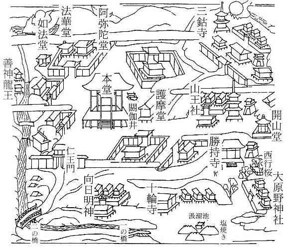 ◆多宝塔 元和7年(1621)賢弘法師再建塔。(元和7年は棟札による。)一辺3.03m、総高12m。 内部には愛染明王を安置。 ○2001/04/15撮影:図1〜7 ○2016/03/31撮影: 善峯寺多宝塔11 善峯寺多宝塔12 善峯寺多宝塔13 善峯寺多宝塔14 善峯寺多宝塔15 善峯寺多宝塔16 善峯寺多宝塔17 善峯寺多宝塔18 善峯寺多宝塔19 善峯寺多宝塔20 善峯寺多宝塔21 善峯寺多宝塔22 善峯寺多宝塔23 善峯寺多宝塔24 善峯寺多宝塔25:手前から釈迦堂、経蔵、多宝塔、護摩堂、護摩堂右は鐘楼の屋根である。 善峯寺多宝塔26 善峯寺多宝塔27 善峯寺多宝塔28 善峯寺多宝塔29 善峯寺多宝塔30 善峯寺多宝塔31 善峯寺多宝塔32 善峯寺多宝塔33 善峯寺多宝塔34 善峯寺多宝塔35 善峯寺多宝塔36 善峯寺多宝塔37 善峯寺多宝塔38 善峯寺多宝塔39 善峯寺多宝塔40 善峯寺多宝塔41 善峯寺多宝塔42 善峯寺多宝塔43 善峯寺多宝塔44 善峯寺多宝塔45 善峯寺多宝塔46 善峯寺多宝塔47 善峯寺多宝塔相輪 善峯寺多宝塔露盤 善峯寺多宝塔宝珠 ◆善峯寺現況 観音堂は西国観音弟20番札所。 西山の山腹にある。長元3年(1030)年源算上人の開創と伝える。法親王が歴代入山し、また浄土宗西山派の道場として隆盛を極め る。この盛時の善峯寺は三尾からなる。南尾は現在の観音堂附近で法華院と号し、中尾は現在の薬師堂附近で蓮華寿院と号し、北尾は現在の三鈷寺の境内地で往生院と号し、坊舎は合わせて52坊を数えたという。しかし、応仁の乱で焼亡す。 近世、桂昌院によってほぼ現在の堂宇が再建され、7坊も再興され、やや旧観に復す。 明治維新で、7坊は1坊に減ずる。現在は比叡山延暦寺に属する。 ・阿智坂明神:開山源算上人(叡山横川恵心僧都源信に師事)に法華院(現在の善峯寺)の霊地を示現し、鎮守となる。 善峯寺領碑 阿智坂明神 善峯寺東門 ・山門:正徳6年(1716)建立。 善峯寺山門1 善峯寺山門2 善峯寺山門3 善峯寺山門4 ・観音堂:西国33ヶ所20番札所、元禄5年(1692)建立。 善峯寺観音堂1 善峯寺観音堂2 ・鐘楼:貞享3年(1688)建立。 善峯寺鐘楼 ・護摩堂:元禄5年(1692)建立。 善峯寺護摩堂 ・経堂:宝永2年(1705)建立。 善峯寺経蔵1 善峯寺経蔵2 善峯寺経蔵3 ・開山堂:貞享2年(1687)建立。 善峯寺開山堂1 善峯寺開山堂2 善峯寺開山堂3 善峯寺開山堂4 善峯寺開山堂5 ・桂昌院廟:宝永2年(1705)建立、桂昌院の遺髪を納める。 桂昌院廟所門 桂昌院廟 ・宝篋印塔:法華経を納める。如法経塚。 宝篋印塔 ・鎮守4社:十三佛堂、弁財天社(明治維新前までは善神竜王社であった)、毘沙門堂、護法堂の4棟ですべて元禄5年(1692)建立。 鎮守各社 護法堂・毘沙門天堂 弁財天社 十三仏堂 ・釈迦堂:明治18年建立。 善峯寺釈迦堂 石造釈迦如来坐像1 石造釈迦如来坐像2 ・薬師堂:中尾の蓮華壽院跡である。以前は釈迦堂の西に並んであったが、昭和63年現在地に移建。元禄14年(1701)建立。 善峯寺けいしよう殿 善峯寺薬師堂1 善峯寺薬師堂2 薬師如来立像1 薬師如来立像2 薬師堂多宝小塔1 薬師堂多宝小塔2 蓮華寿院跡 法親王墓碑1 法親王墓碑2 歴代祖師墓碑 本庄氏一族墓碑 ・阿弥陀堂(常行堂):寛文13年(1673)建立。 善峯寺阿弥陀堂・書院 善峯寺阿弥陀堂 阿弥陀如来坐像 善峯寺書院 善峯寺本坊山門 善峯寺本坊俯瞰 ・文殊寺宝館:平成11年建立。 善峯寺文殊寺宝館 ・往生院旧跡は西山上人善恵証空が入寺し、三鈷寺と改号、浄土宗西山三派の信仰地となる。 三鈷寺山門 善恵上人廟拝所 善恵上人廟 三鈷寺本堂 三鈷寺客殿・庫裡 ◆善峯寺参詣曼荼羅 ○「描かれた日本の中世」下坂守、法蔵館、2003 善峰寺参詣曼荼羅(善峰寺蔵): 善峰寺には2幅の参詣曼荼羅が伝来する。しかしこの2幅は全く別の構図であり、堂塔も共通するものが全くないとい云ってもよい程の異本である。 この2幅のうち、 参詣曼荼羅A本は、「想定図」で示されるように、確かに善峰寺およびその参詣道を描いたものであるとされる。 善峰寺参詣曼荼羅A本 善峰寺参詣曼荼羅A本(塔婆部分) :「図説 日本の仏教6 神仏習合と修験」より、善峰寺蔵 善峰寺A本想定図:「描かれた日本の中世」より ※以上A本想定図のように、A本は「善峰寺の景観」を映したものであるとされる。 但し、本堂右手(北)の広場に三重塔(大日如来)が描かれているのは、どういう事情かは不明。 なお図の右上の伽藍は三鈷寺伽藍で多宝塔(大日如来)は三鈷寺多宝塔とされる。 善峰寺参詣曼荼羅B本: 善峰寺蔵 B本も善峰寺に伝来したものであるが、子細に検討すると、A本とは全く異にし、善峰寺を描いたものとは思われない。ではどこの霊場が描かれているのか。第1の候補は隠居所であった三鈷寺であり、その本堂及び附属堂宇は古の三鈷寺のそれに極めて類似している。しかしながら三鈷寺とすると、絵の下部の景観は全く説明がつかないものとなる。 谷直樹氏はこの絵の景観の下部は伊勢内宮と外宮であり、寺院は朝熊山金剛證寺であるとの説を提唱した。その根拠は伊勢参詣曼荼羅の図柄と一致するというものであった。確かに神社の社殿、五十鈴川に架かる宇治橋(反橋)などほぼそっくりといってよい。だとすると、このB本