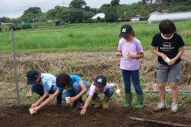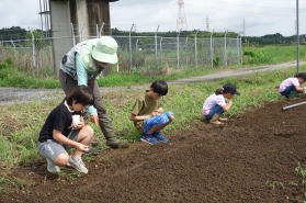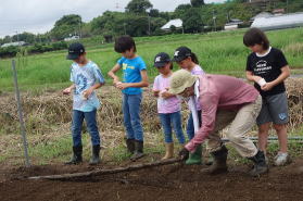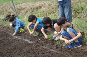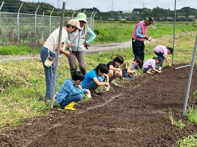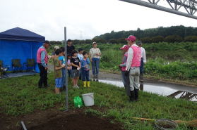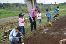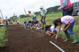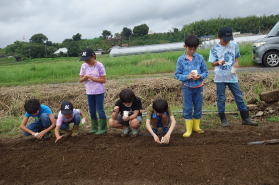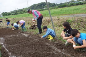・この日は雨上がりの曇りぞらの中、湿度が高くて汗をかきながらの作業となりました。今回は、「八千代市民プレーパークの会」から子どもさんたちが種まき応援に参加してくれて楽しい作業となりました。