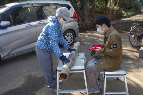 桜祭り用のイルミネーションとして「竹灯り作り」を開始しました。