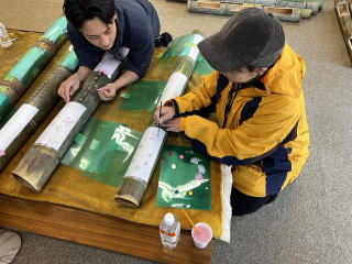 ■明かり窓への和紙の貼り付け作業 |