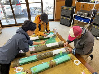 前回(2月22日・日曜)に引き続き、桜祭り用のイルミネーションとしての「竹灯り作り」を実施しました。