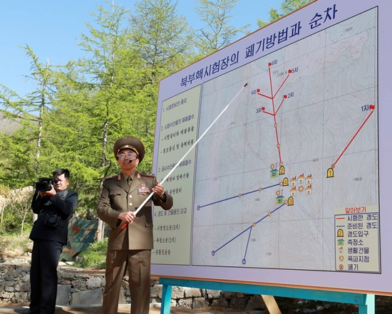 彼は、“四番目の段階は、試験坑道と地上建物を全部なくすこと”とし、“3つの試験坑道と二つの測定所などを爆破する作業は、記者の皆さんが見守る中、施行される”と話した。“最後の彼は、“四番目の段階は、試験坑道と地上建物を全部なくすこと”とし、“3つの試験坑道と二つの測定所などを爆破する作業は、記者の皆さんが見守る中、施行される”と話した。“最後の段階である、残っている人員を撤収させ、核試験場周囲を完全に閉鎖する事業は、今後、早い期日内に結束されることになる"と伝えた。