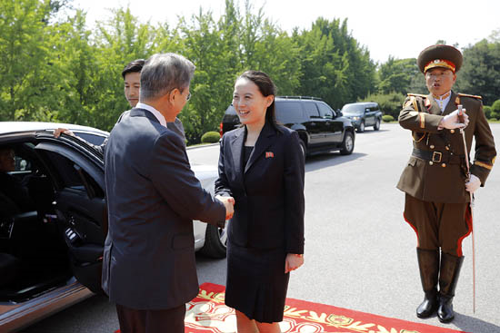 ▲金汝貞(キム・ヨジョン)朝鮮労働党第一副部長が、文在寅(ムン・ジェイン)大統領を出迎えている[写真提供 青瓦台]