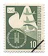 5月9日の終戦記念日に発行された、ドイツ人捕虜をテーマにした切手です。人物の白い部分は、やせ衰えた捕虜の横顔がエンボス加工されています。発行後、この図案が東ドイツ当局の怒りにふれ、この切手を貼った西ドイツからの郵便物は、東ドイツ側で切手を黒く塗りつぶして配達されるか返送されました。これは、東ドイツの国民そのものが西ドイツ側から捕虜に見えていると解釈されたからと思われます。10Pfnnig切手の場合、通常、刷色が緑色であるところが、この切手だけは灰色になっていて、切手の発行の意図が強調されていると言えます。