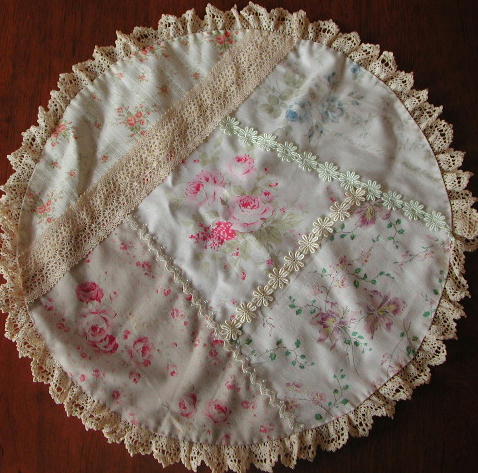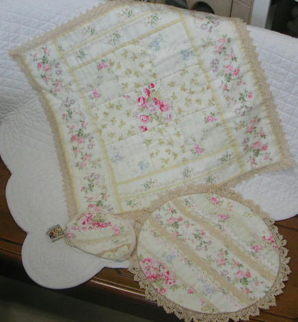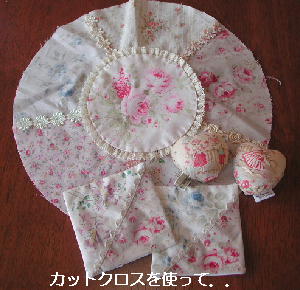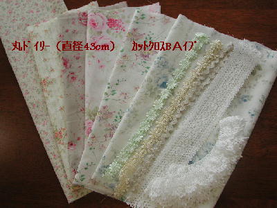 | パステルカラー花柄カットクロス 角、丸ドイリー レシピ入り \2700 特価¥2200 ボーダー花柄布 50x110cm 黄色バラ柄布 30x54cm 青バラ柄布 30x54cm ピンクバラ柄布 30x54cm 大柄バラ柄布 30x54cm トーションレース (角縁取り用) 205cm ギャザートーションレース(丸縁取り用) 100cm この材料で角、丸ドイリー各1枚できます. 用意するもの キルト芯 48x50cm(角) 31x31cm(丸) 裏布50x52cm(角) 33x33cm(丸) 丸ドイリー用のレース 3種 66cm |