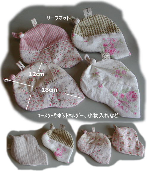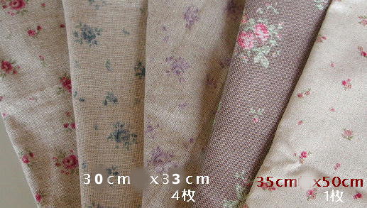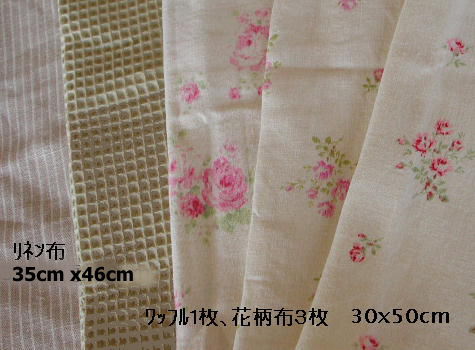 カットクロス5枚組 綿麻 Cut-6 ¥1180 リーフマットのレシピ付 キルト芯は入ってません. リネン布35x46cm 1枚 ワッフル布 30x54cm 1枚 綿麻洗い花柄布 30x54cm3枚 |